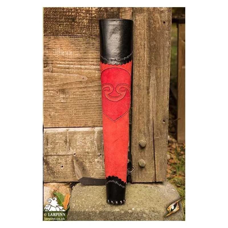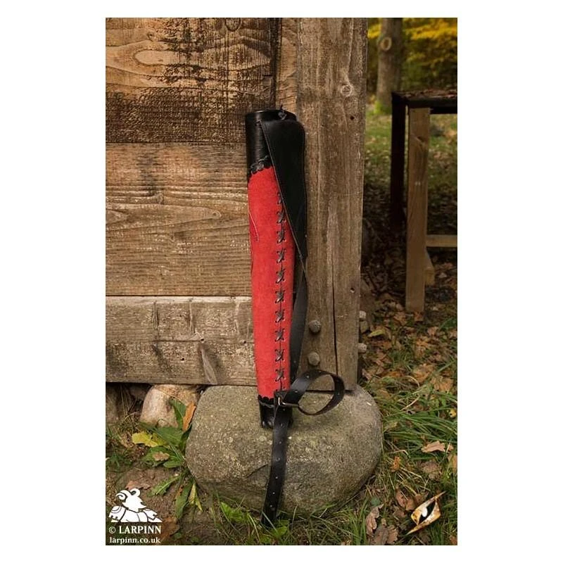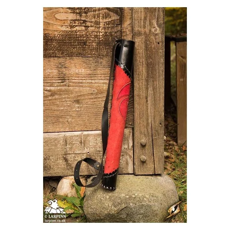 Epic Armoury’s Archer Quiver is a handsome tapered quiver designed to carry a supply of arrows with you on your adventures. It fits most LARP arrows and is made from chrome-tanned plated-leather with a soft split-leather exterior. Ornamental split-leather patches decorate this quiver to give it an embellished appearance. The circular bottom is stitched to the body with a similar flattened leather cord used along the top.