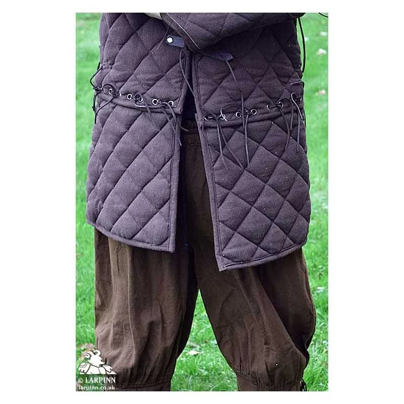 The Arthur Gambeson line is designed to be highly adjustable and modular. The padded armour is perfect for protection under plate armour and chainmail. The gambeson has around 2cm thickness of polyester padding sewn into a diamond pattern; this pattern ensures the gambeson is still moveable. The gambeson is closed with 4 buckled straps and has eyeletted loops on the base hem and the arms to fit optional tassets and arms.