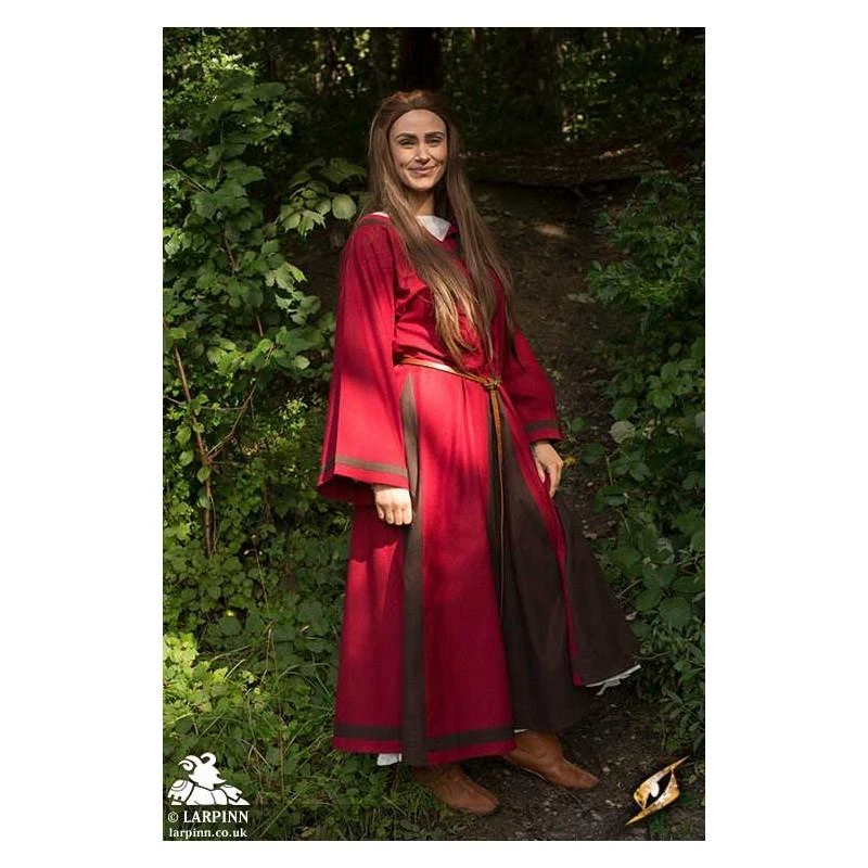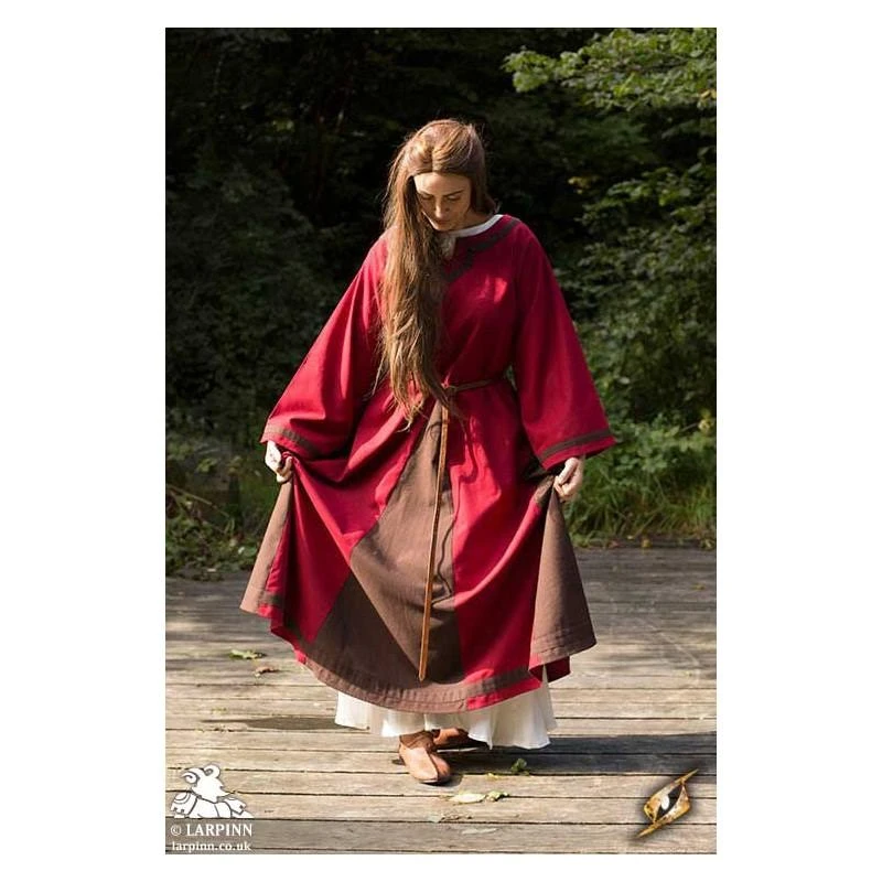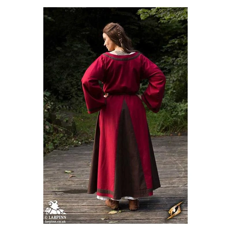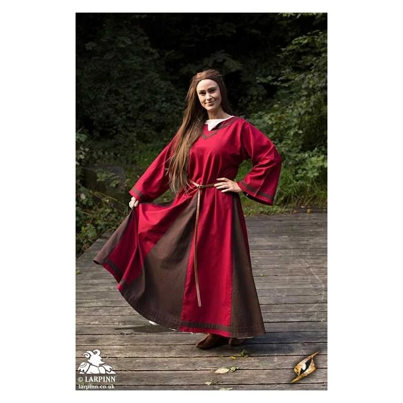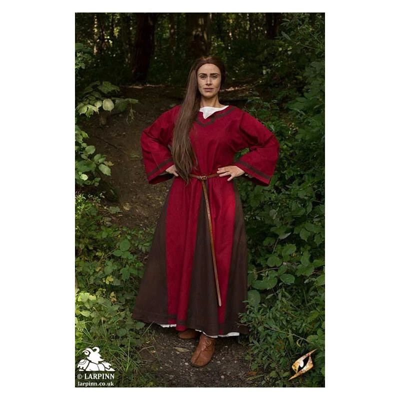 Epic Armoury’s Red/Brown Dress Astrid is a scandinavian inspired slip-on dress with long bell sleeves. The V-cut neckline, wrists, and skirt are trimmed with a contrasting brown ribbon. Made from durable, medium canvas cotton, this dress reaches from the shoulders to the ankles and has a comfortably wide blue and brown gusseted skirt to allow for easy movement.