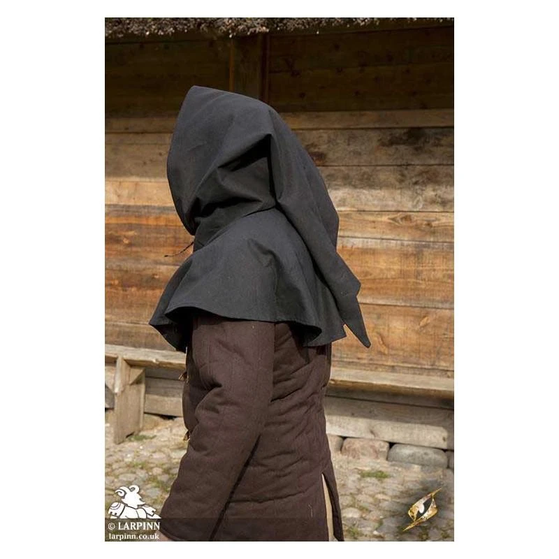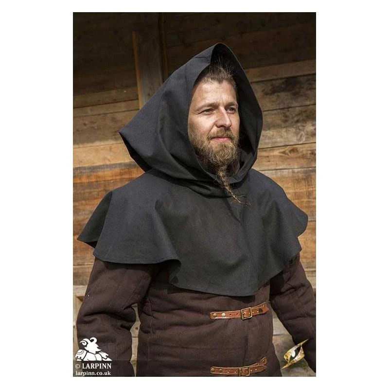 Epic Armoury’s Basic Hood is a hood with a short mantle and long hood tail. The mantle covers the shoulders, keeping the upper chest covered while the roomy hood can be pulled down to cover part of the face. Made of medium canvas, this lightweight hood provides protection from the elements without being too warm in potential heat.