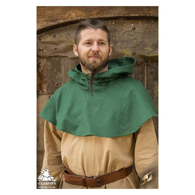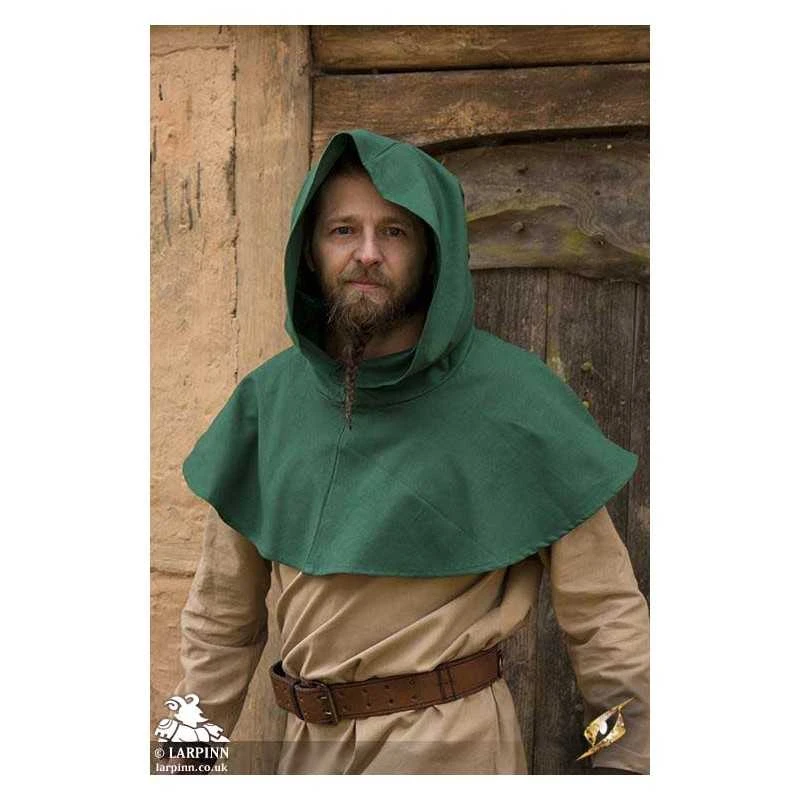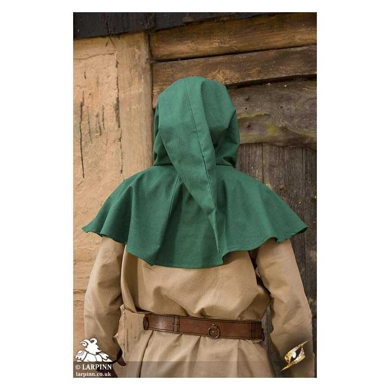 Epic Armoury’s Basic Hood is a hood with a short mantle and long hood tail. The mantle covers the shoulders, keeping the upper chest covered while the roomy hood can be pulled down to cover part of the face. Made of medium canvas, this lightweight hood provides protection from the elements without being too warm in potential heat.