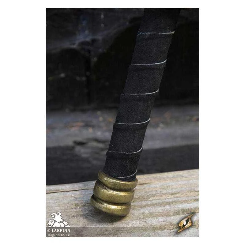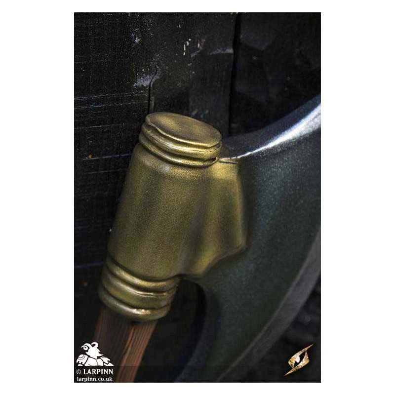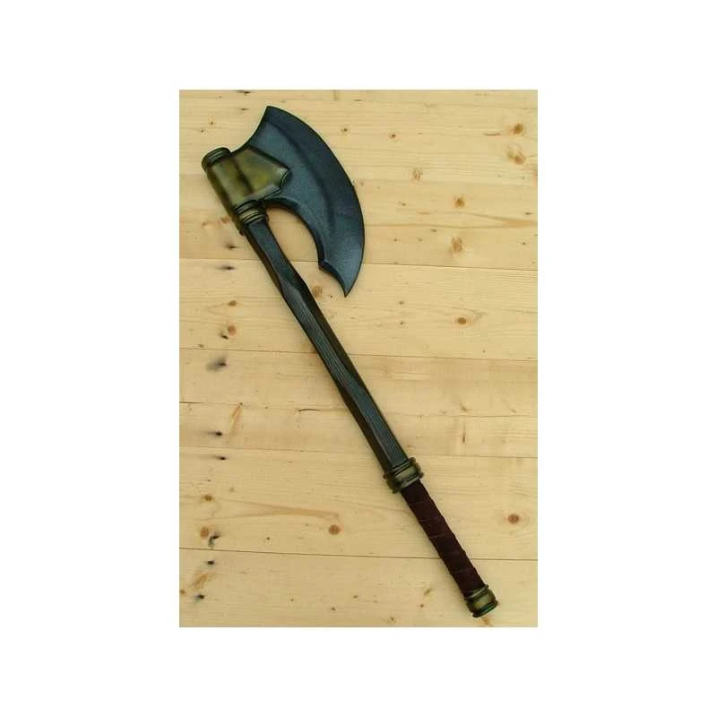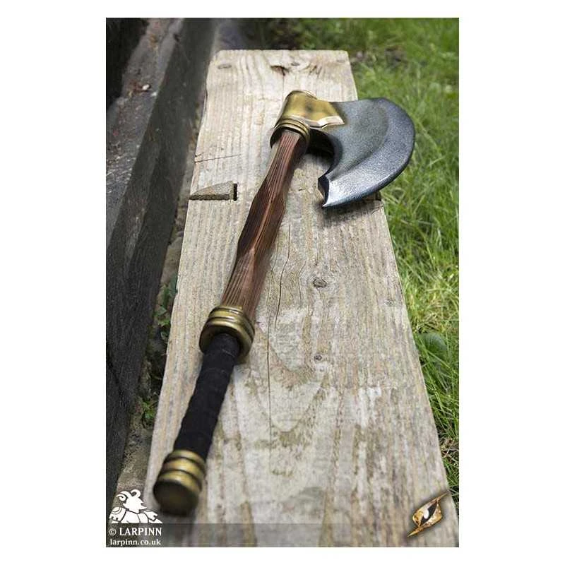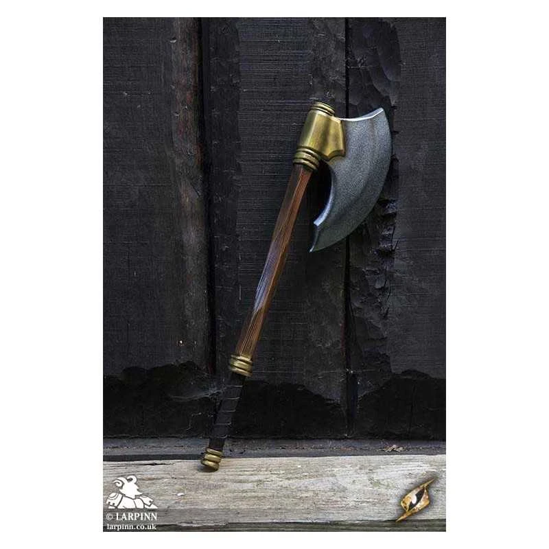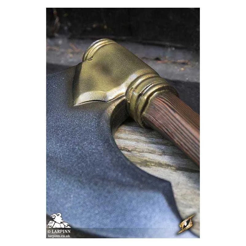 Epic Armoury’s Battle Axe is the proper weapon for Northern Dwarven warriors. With a solid crescent-shaped head curving back towards the wood-textured haft, this axe is made to be effective in close-combat. The head has a long curved 36 cm edge, and its 16 cm width is secured to the haft by a large gold plate. The total length of the weapon is 80 cm, with a sculpted pommel and a 25 cm handle bound in split-leather.