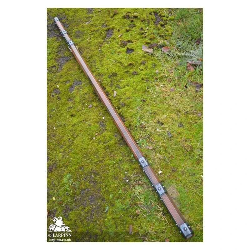 The Braced Staff is a 190 cm latex quarterstaff with heavy metal braces at each end. Each iron brace is about 40 cm long, with sculpted studs securing them in place. The hexagonal shaped staff appears carved from dark brown wood, and is detailed with wooden textures and is handpainted to match.