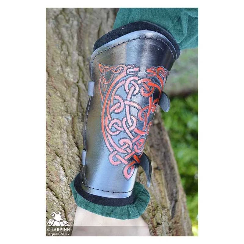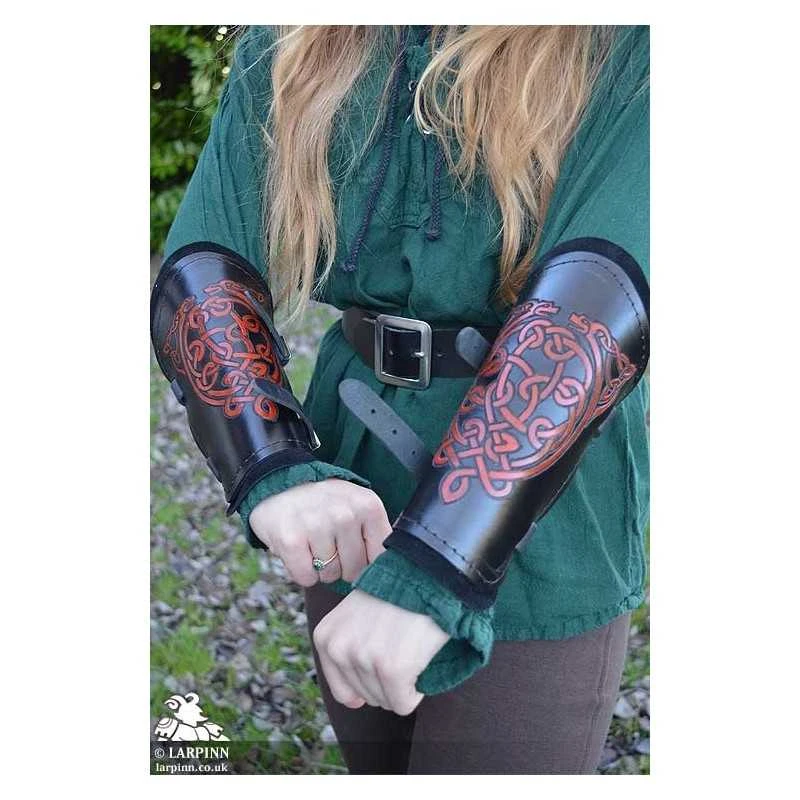 These bracers are made from two layers. The top layer is high-quality veg tan leather, embossed with the design and hand-dyed. The back plate is made from soft suede to add comfort. The supple leather molds to the wearer’s arms over time, ensuring a personalized fit for maximum mobility.