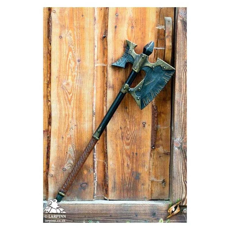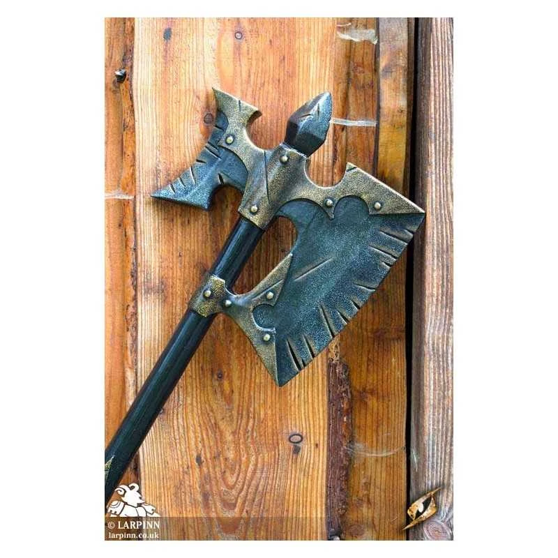 Epic Armoury’s Chaos Axe is a deadly and menacing 110 cm two-handed axe designed for the brutal and barbaric maurauder. It has a 32 cm long axe-blade with detailing that makes it look battered, used and brutal, an execellent companion piece for your less than merry fighter or blood thirsty barbarian at your next LARP. The head is hand painted to look like real metal embellished with gold, and nicks in the steel to emphasize the used aesthetic, and it is made of safe, soft foam. The bladed head attaches to the shaft which is hand painted. The 37 cm grip at the end of the Chaos Axe is wrapped in suede leather for appearance and comfort.