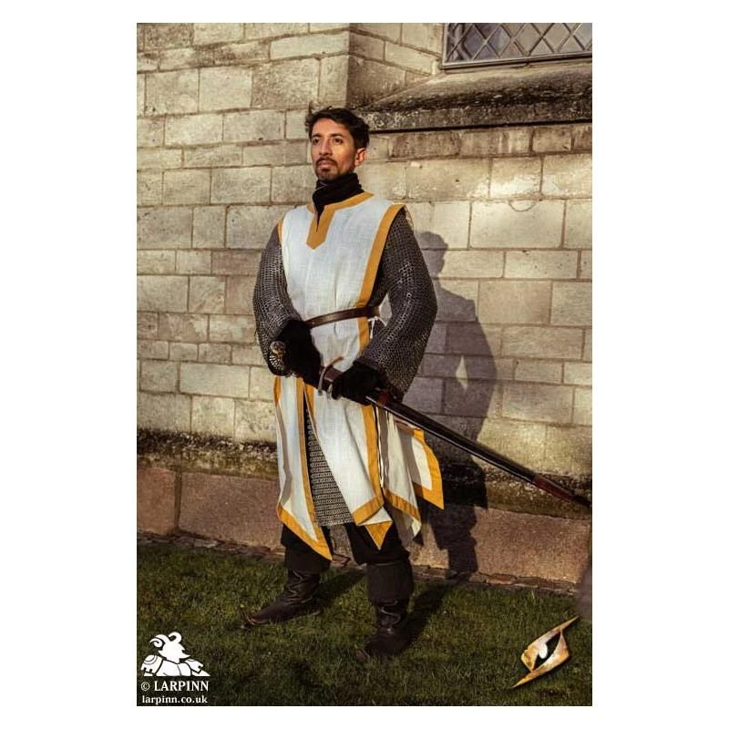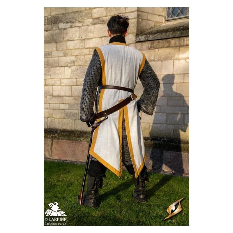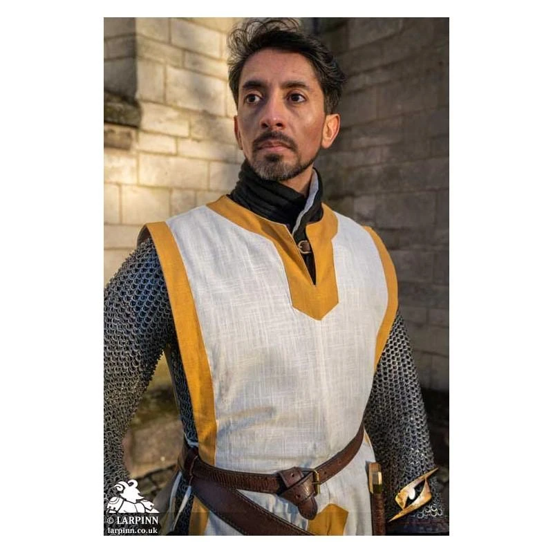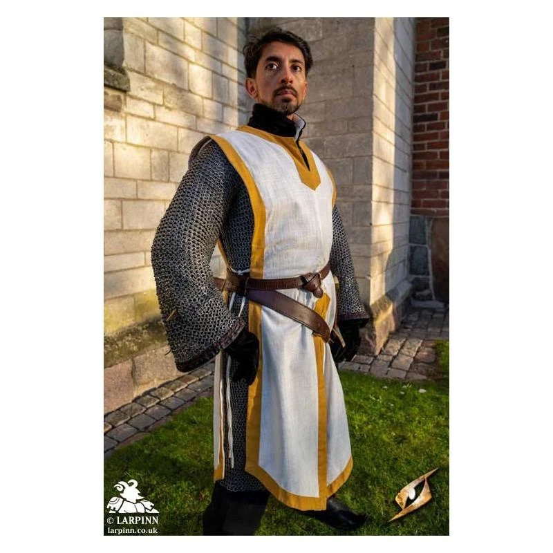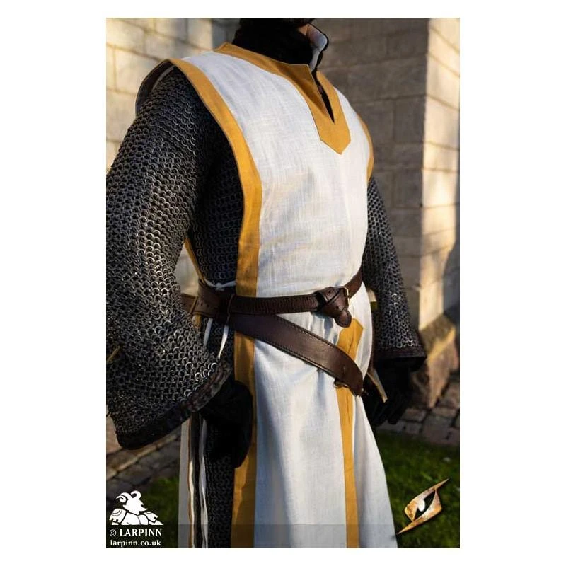 Knights of old will adore wearing Epic Armoury’s Clement Tabard. This sleeveless jerkin is designed to be worn as an outer dress over your medieval costume or armour and is made from roughly woven cotton. Our sleevless coat is made from white knitted cotton embellished by a beige trim. Our rugged-looking medieval tabard is quickly secured at the waist by cotton ties so you may quickly enter battle and defend your territory. Use it to display your heraldry, guild affiliation or to help boast your deeds and protect your uniform as you Larp.