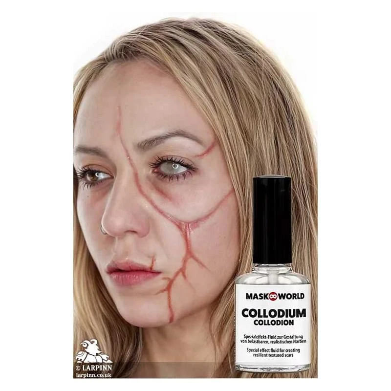Collodium is the non-flexible form of collodium, a syrupy solution made from pyroxylin in an ether and alcohol solvent. This rigid collodium is great for theatrical makeup effects, including scarring, wrinkles, and burns.