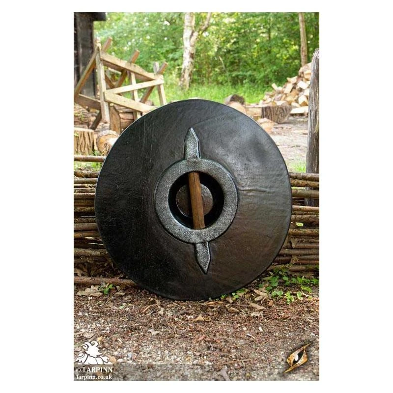 Pair this Drang Shield with a Viking Axe and impress your fellow warriors on the battlefield. Its slight convex shape and iron boss on the front provides an edge in combat, and its reliable punch-grip fits comfortably in your hand thanks to its brown suede wrap and shape. Keep your shield in great condition with regular latex maintenance.
