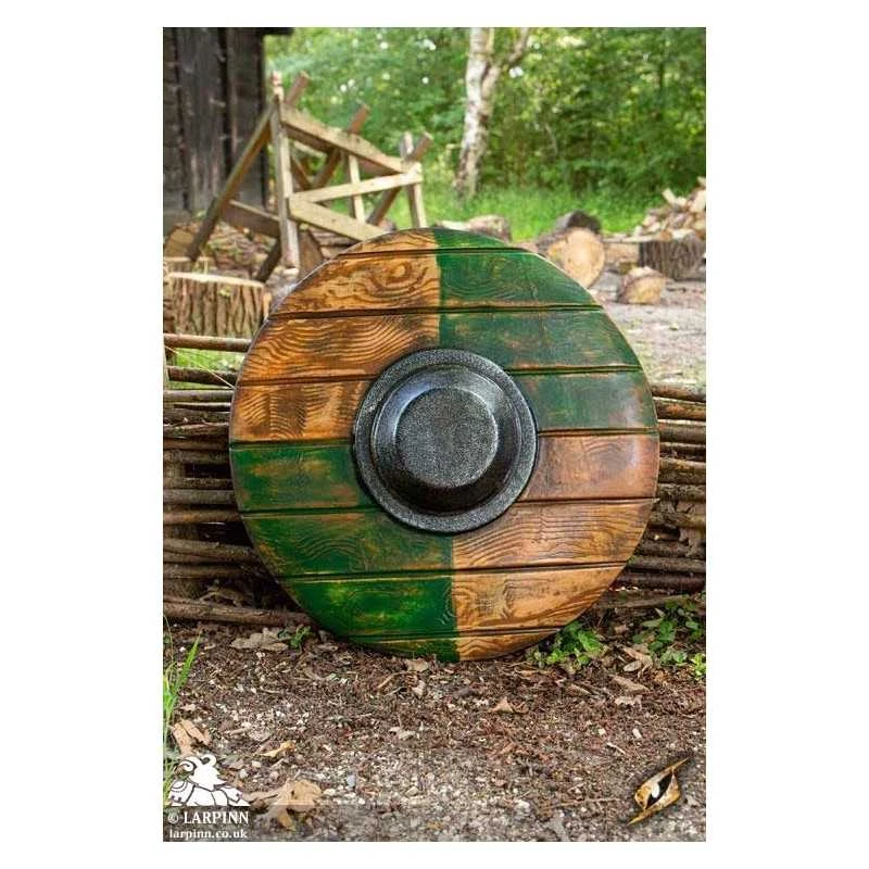 Epic Armoury’s Green/Wood Drang Shield is a 50 cm round latex shield perfectly designed for coastal raids. Inspired by early Vikings and Saxons, this Live Action Role Play (LARP) safe shield looks just like the real thing–without hurting your costumed buddies. Featuring a realistically textured surface and hand painted finish, this shield appears to be made from wood around an iron boss. Green paint decorates its face, purposefully faded to give it that weathered and used appearance.
