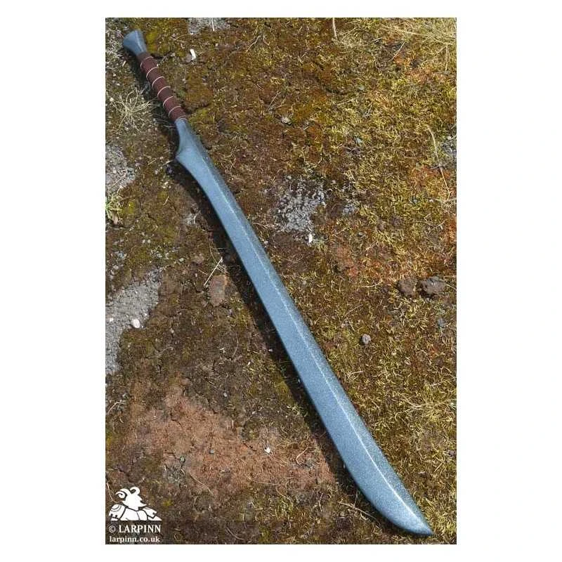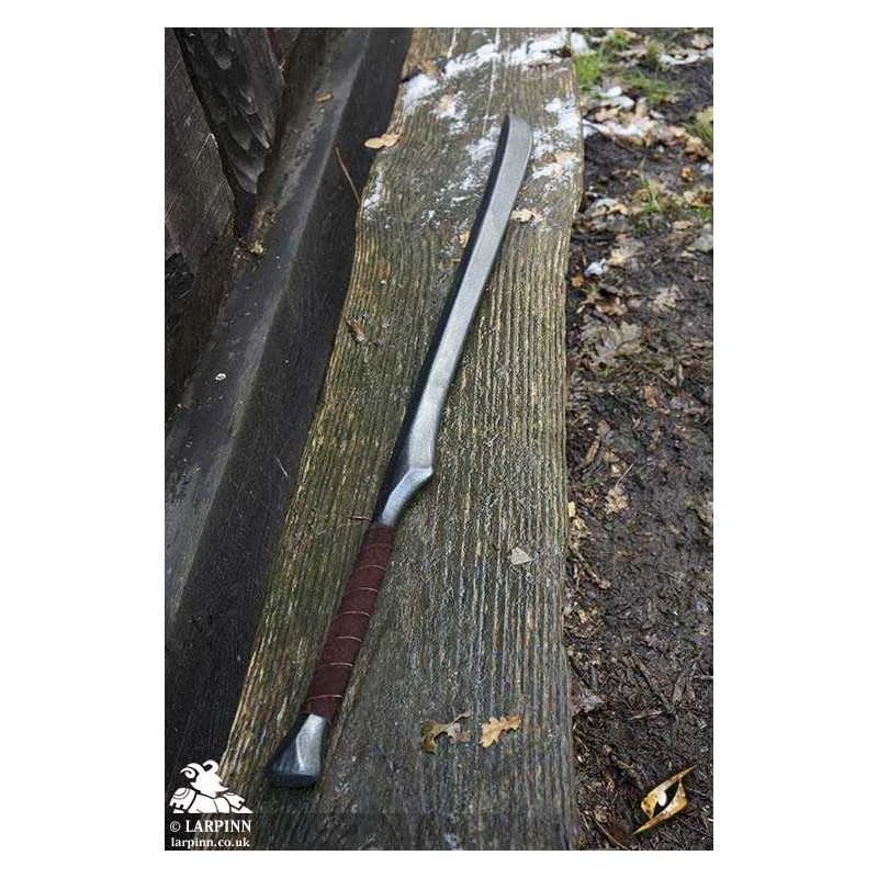 This Epic Armoury Elven Blade is a lithe and elegant medium-length blade with an elven design. The sword is 110 cm long, with a 82 cm gracefully curved blade. The blade has a single-edge with a straight short edge, adding to the clear and recognizable style of the weapon. While it has no cross-guard, the 20 cm oval-shaped handle is wrapped in split-leather in order to give the most comfort and grip.
