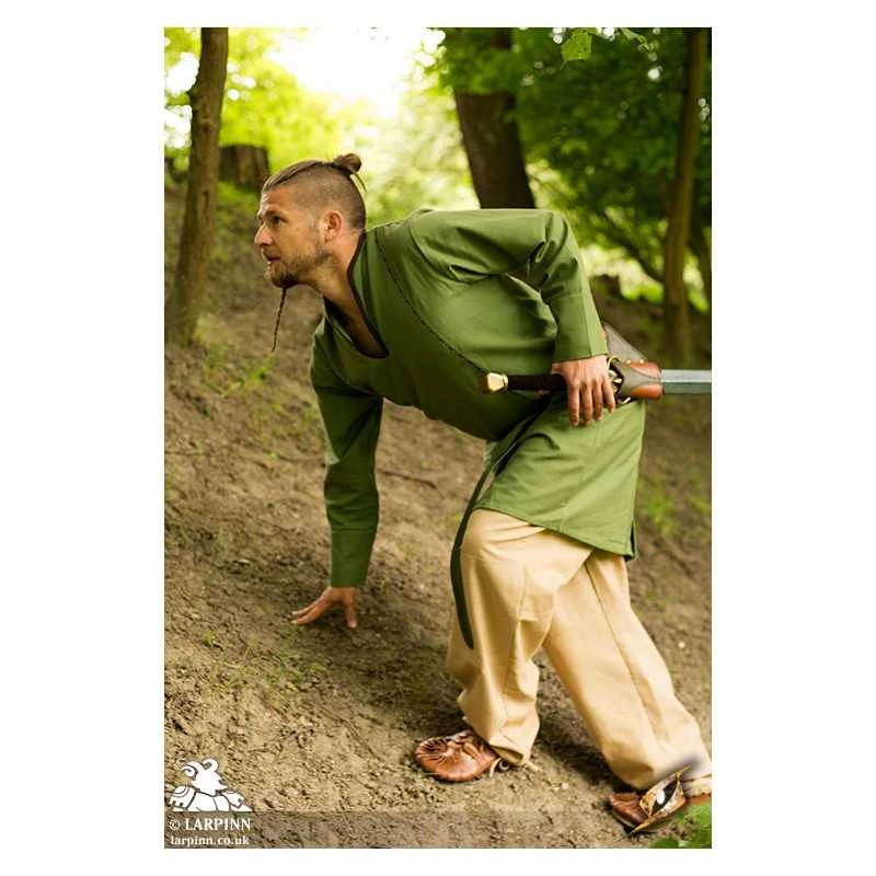 Epic Armoury’s Elven Tunic is a long-sleeved embroidered shirt designed in an elven style, with a narrow V-shaped neckline. Reaching from the shoulders to the knees and made from soft, dyed cotton, this tunic can be a costume all by itself–or work as a base layer in a more complicated design. Move around the forest easily thanks to an A-cut at the front of the hem, and feel relieved to know that the narrow cuffs won’t get in the way of your Elven Bow. Embellished with elven-inspired embroidery and matching edging along the neck, this elven cut tunic is an essential and long-lasting piece in any costuming wardrobe.