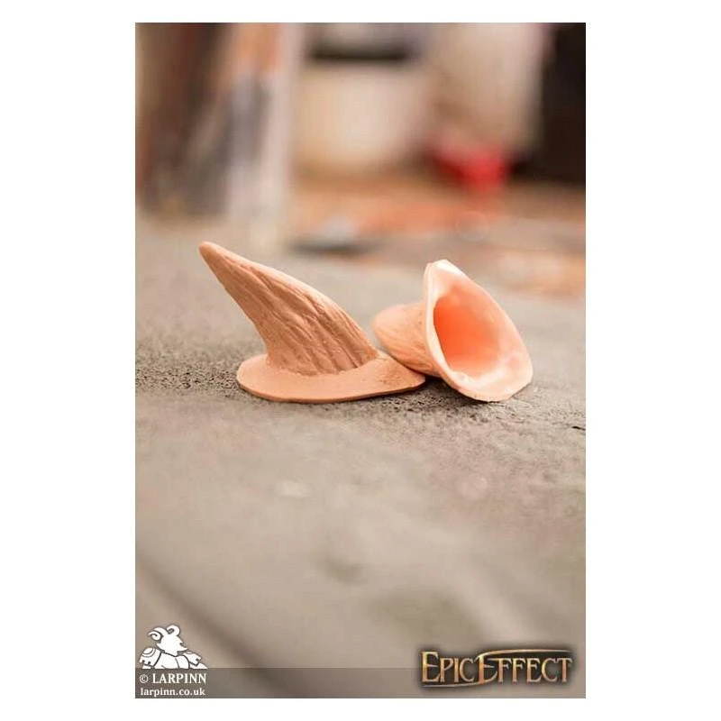 Epic Armoury’s Devil Horns contains two curved latex-prosthetic horns sculpted to look like demonic horns with vertical ridges. The horns are 6 cm long with a strong curve and tusk-like texture. The large contact-surfaces makes it easy to fasten and keep the horns attached for sustained periods of time. Application of this prosthetic is easy using Epic Effect Prosthetic Power Glue, Mastix Spirit Gum or other prosthetic adhesive. Use these horns for your fiendish costume, or for a character who has been afflicted with dark or infernal powers.