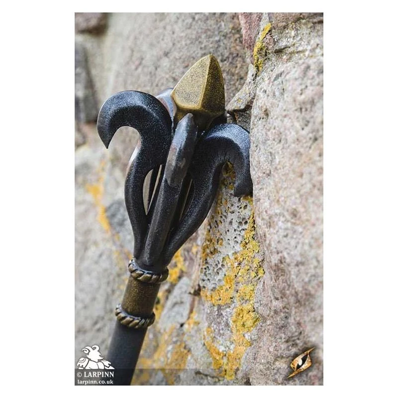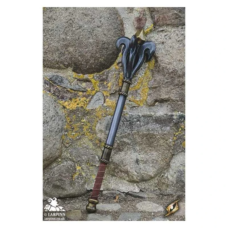 Epic Armoury’s Fleur Mace is an 88 cm one-handed mace with a decorative design. It features a large head with five hooked flanges and a pointed “crown,” sculpted and hand painted to look like real metal. The head is actually made of soft foam, reinforced with a harder foam core. It attaches to the shaft, hand painted and sculpted to look like matching steel reinforced by brass cuffs. The 17 cm long grip has been wrapped in suede leather for an ergonomic fit in the hand.