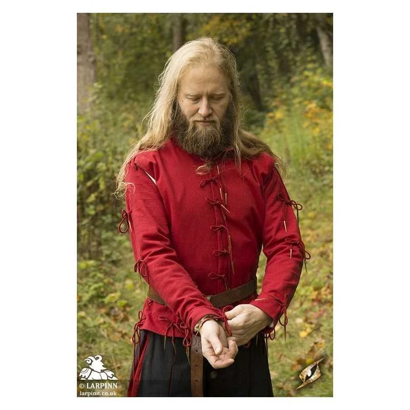 Epic Armoury’s Dark Red Pourpoint is a form-fitting long-sleeve coat covering the torso from the neck to the hips. It can be worn on its own or serve as padding under mail or armour. The pourpoint is donned like a jacket and secured along the front, sides and back with cotton cords, allowing you to customize the tightness of the fit. The arms are easily detachable by untying its cotton cords on the shoulders, each cord secured through long-lasting brass eyelets. Worn like a proper knight, you may attach hose and a leg harness to the four eyelets on the bottom front hem.