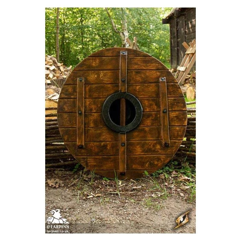 Epic Armoury’s Vegvisir Iarla Shield is a 70 cm round latex shield that will be your companion to the furthest shores and back. You fear no storm or rising tide with your Iarla Shield at your side! Inspired by early Vikings and Saxons, this Live Action Role Play (LARP) safe shield is carved from EVA foam to look like true wood. Coated in a layer of durable latex, it features a wood grain texture on both the front and back–something that makes this shield truly unique and perfect for a truly immersive look. You can even find small sculpted nails hammered into the braces, because attention to detail is so important.