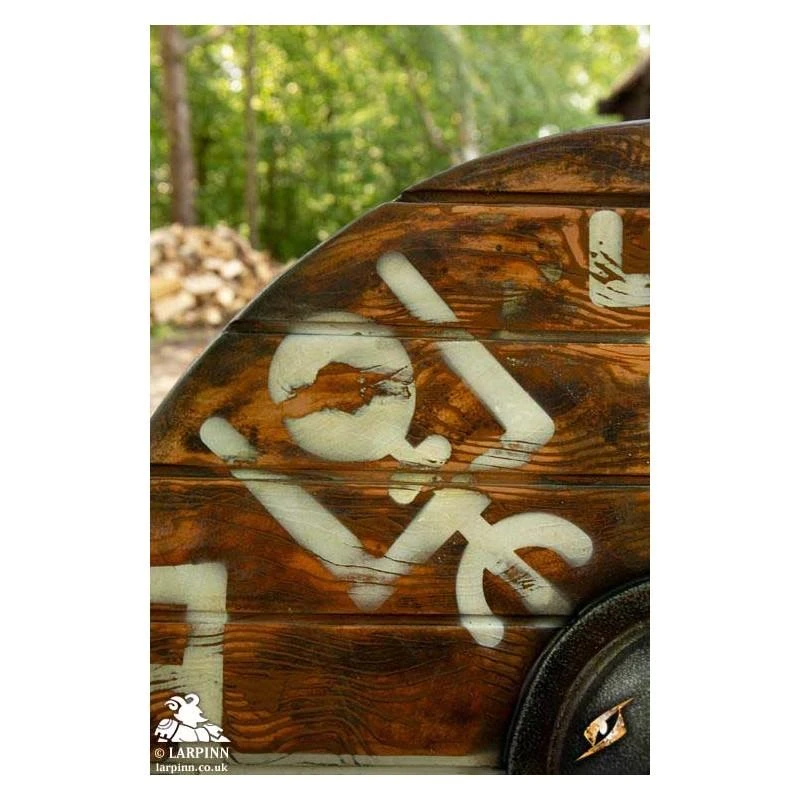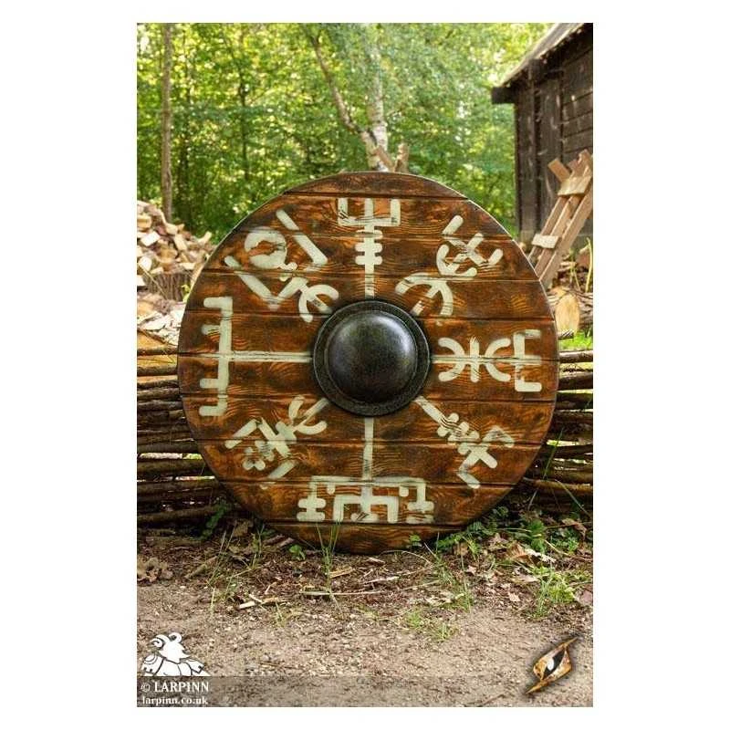 This shield has been hand painted, with white paint decorating its face in an Icelandic design intended to help you on your path. Its slight convex shape and the metallic-painted boss on the front provides an edge in combat, and its reliable punch-grip fits comfortably in your hand thanks to its suede wrap and shape. Keep your shield in great condition with regular latex maintenance.