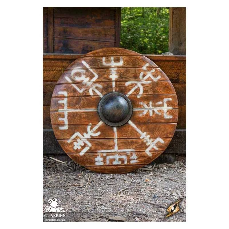 This shield has been hand painted, with white paint decorating its face in an Icelandic design intended to help you on your path. Its slight convex shape and the metallic-painted boss on the front provides an edge in combat, and its reliable punch-grip fits comfortably in your hand thanks to its suede wrap and shape. Keep your shield in great condition with regular latex maintenance.