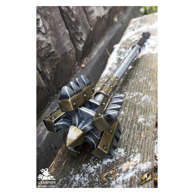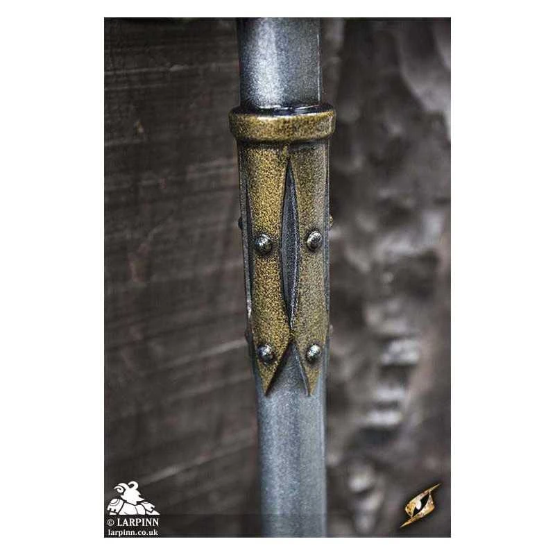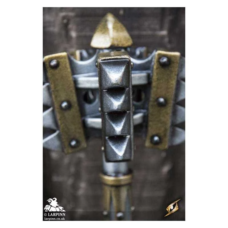 The haft is round with an all-steel finish and golden embellishments between head and the 28 cm long handle. The handle is bound in brown top-grain leather, giving the wielder a firm grip and the option of using the weapon one or two-handed. The weapon ends in a large cone-shaped pommel. Made from durable closed cell foam around a fibreglass core and finished with a strong latex coating, you can feel confident that your LARP weapon will provide the safety and appeal you want when crafting your kit.