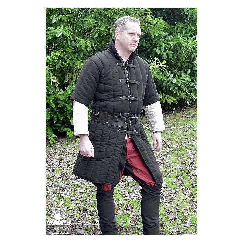 The Leopold Gambeson is an example of a simple medieval padded jacket. This variation has short sleeves which are fixed to the torso and a high collar that provides protection from neck and shoulder armour. You can easily adjust this jacket to the wearers body by using the five belt buckles on the front.