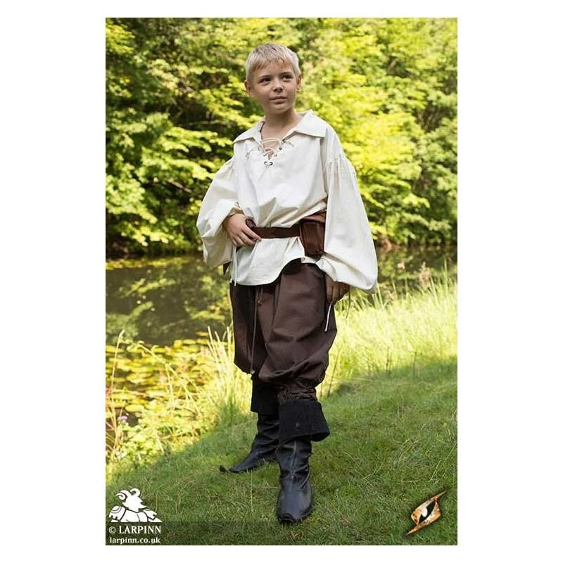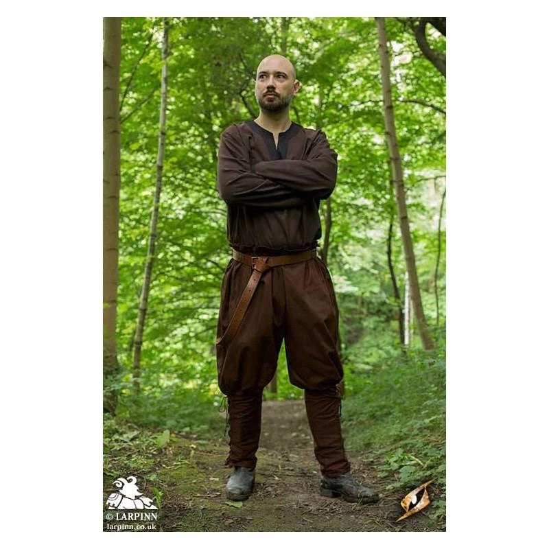 Above the knees, these pants are extra wide and narrow sharply at the knees. Below the knee, these pants are slim and can be adjusted by cotton tie strings reinforced with a cloth-brace on the inside of each leg. This allows the wearer to tight-fit the leggings around the shins. Around the waist, the Medieval Pants are fitted with a long cotton drawstring visible only at the abdomen. This keeps the pants in place while leaving plenty of room for a belt. The pants are made from black, textured, medium cotton fabric.