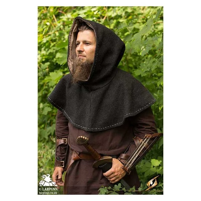 Epic Armoury’s Medieval Hood is a hood with a mantle and long hood tail. The mantle covers the shoulders, keeping the upper chest warm while the hood protects the head and face from harsh wind. Made from felted, blended wool and lined on the inside with soft cotton, this hood is comfortable and solid. Decorative stitches line the hood and hem, embellishing and adding great detail to a practical product.