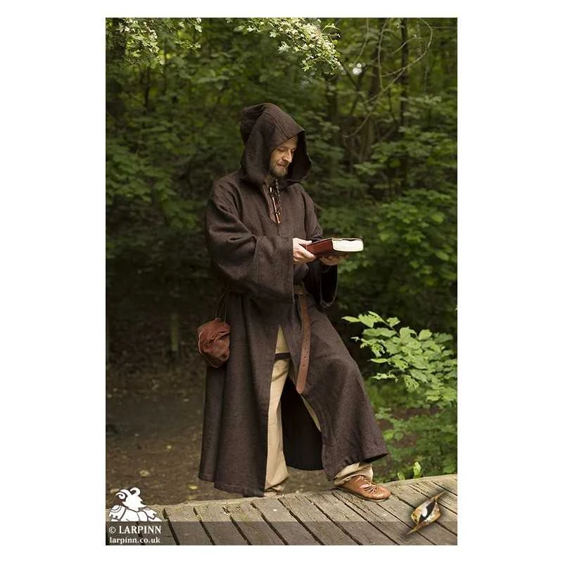 Epic Armoury’s Robe Benedict, or the Monk Robe, is an all-purpose robe made from textured cotton and secured below the neck with a cotton tie-string through a soft-leather plate. Whether it is worn open or closed, this versatile long-sleeved robe is an essential when adding layers to almost any character’s costume. The robe’s hood, roomy sleeves and length combine ease of movement with the best degree of protection from wind, rain or sun. Made from cotton, this robe is easily made waterproof.