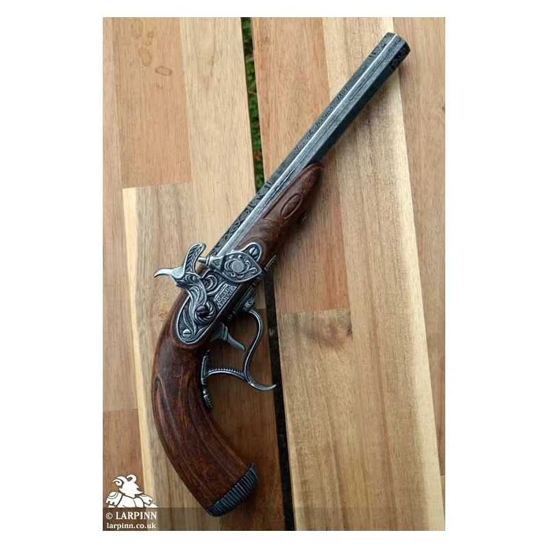 The ‘Newport Percussion / Flintlock Cap Pistol’ is an imitation 17th century Italian flintlock pistol. This is NOT A REAL GUN and instead can be used with single caps to complete your perfect Larp, Halloween, theatre or cosplay character. Ideal for a pirate, the ‘Blackbeard Percussion / Flintlock Cap Pistol’ is made from polished wood and zamac metal.