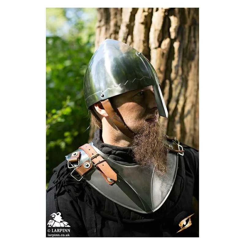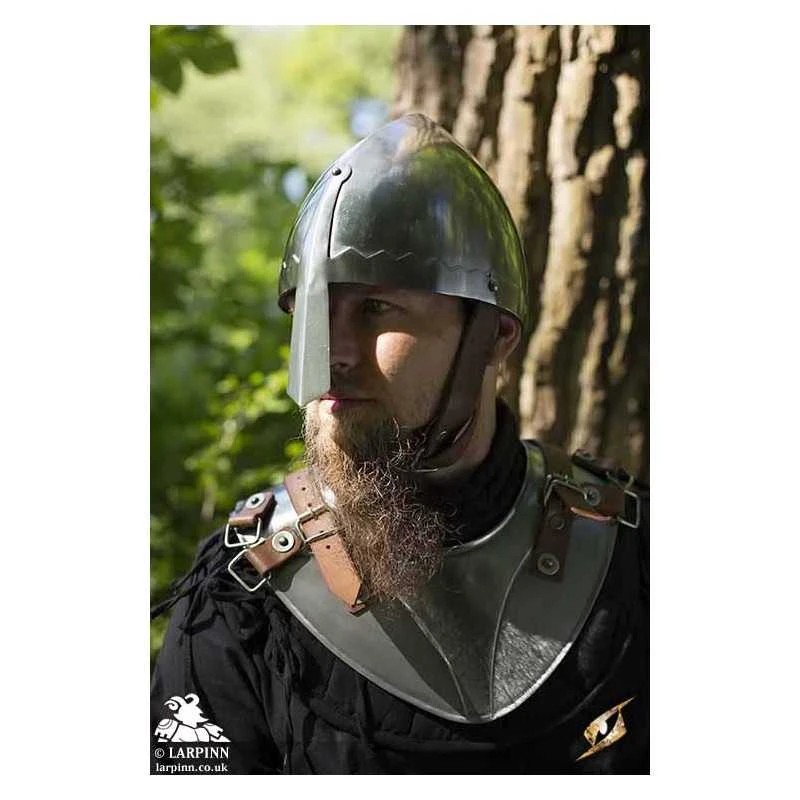 The Norman Nasal Helmet is a conical skull cap offering basic protection to the head and face. Inspired by the historical helmets worn during the majority of the middle ages, the Norman Nasal Helmet features a decorated nasal plate which runs from the forehead down over the bridge of the wearer’s nose. A ridge runs along the cap to give the helmet additional reinforcement while on the battlefield.