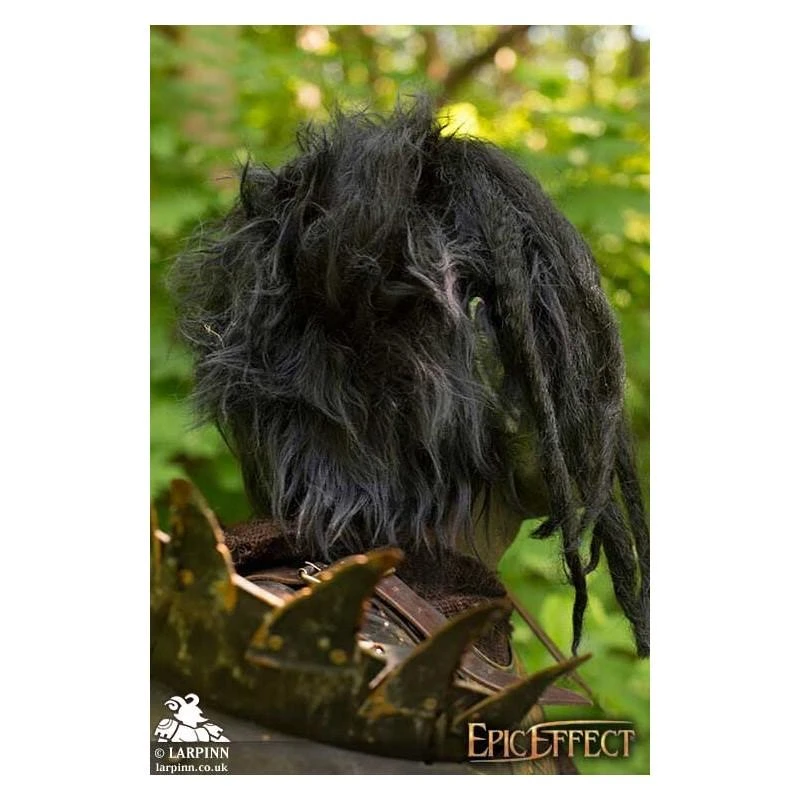 Epic Effects’ Green Orc Brute with Hair is a full Orc Mask with a tribal appearance, perfect for the clan’s hunter. The mask has an orc’s distinct features, including: a low, broad forehead, serrated pointy ears and a flat nose with large, triangular nostrils to give it a predatory look. The broad mouth juts out in an underbite with visible bottom teeth and tusks. Heavy dreadlocks hang down over leathery skin modeled with creases and a realistic handpainted dark green complexion.