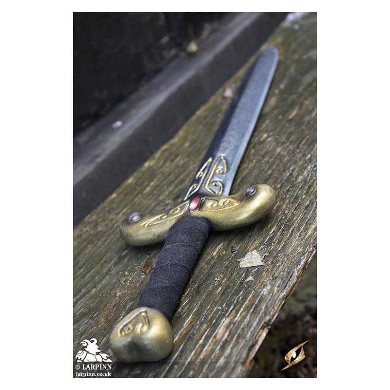 The Princess Sword is a short sword with a comfortable split-leather wrapped handle. The crossguard has an elegant design, detailed with golden engravings and precious gems to give it a luxurious appearance. At the end of its 13 cm grip is a heart-shaped pommel with the same rich detailing. The blade has a graceful fuller running its 44 cm length with gold runic details carved near the hilt.