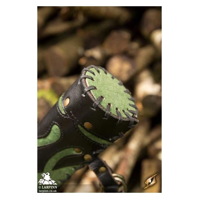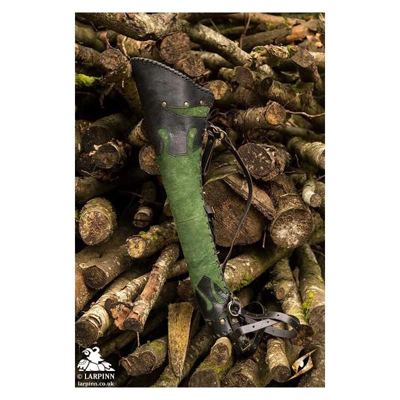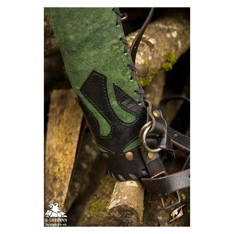 The Ranger Quiver is worn over the shoulder thanks to its 90 cm adjustable leather strap, brass-plated iron buckle, and 32 pre-punched holes. An additional 70 cm adjustable belt anchors the quiver around the waist, or to a baldric or pack. This quiver has a beautifully detailed style and colour and matches other Epic Armoury leather items, making it a good choice for an elf or noble archer with a fat purse.