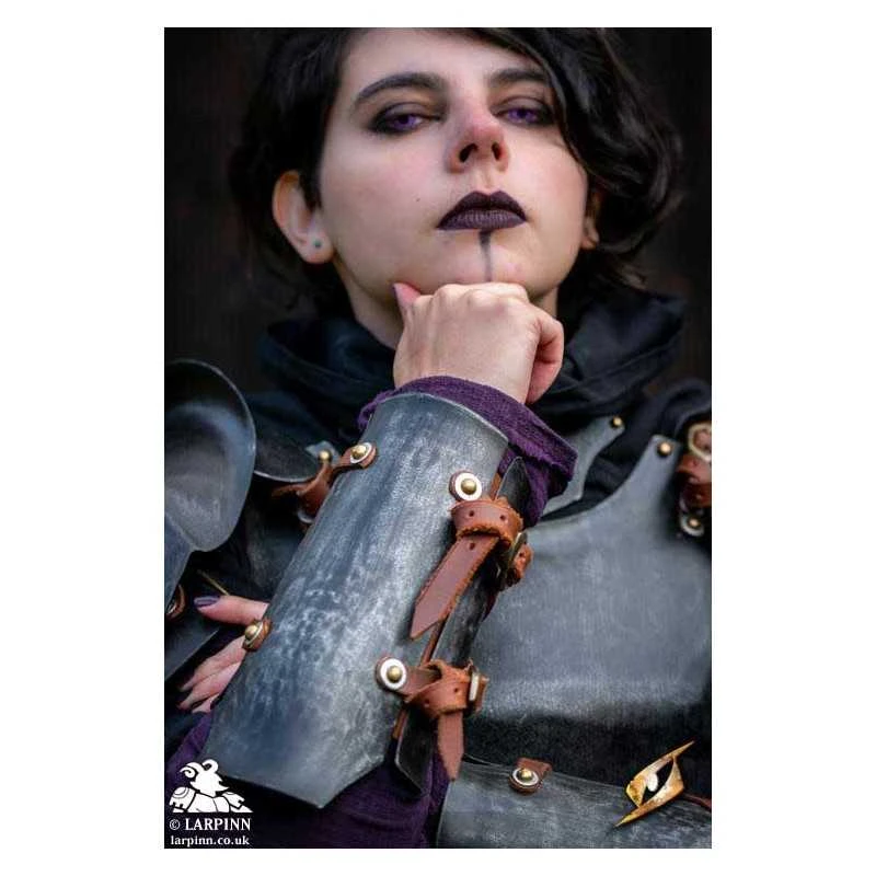 The Epic Dark Renegade vambraces is a set of vambraces designed to shield the wrist amd ar,. Handcrafted from 1mm thick mild steel, these vambraces features a malleable plate that wraps around your wrist and arm plate that provide great protection and movement, while also having a neutral look that makes it fit with many different designs. The shape of the vambrace. is specifically designed to be more comfortable for a female player. These vambraces are secured with two vegetable tanned leather strips , offering a secure fit while maintaining high mobility.