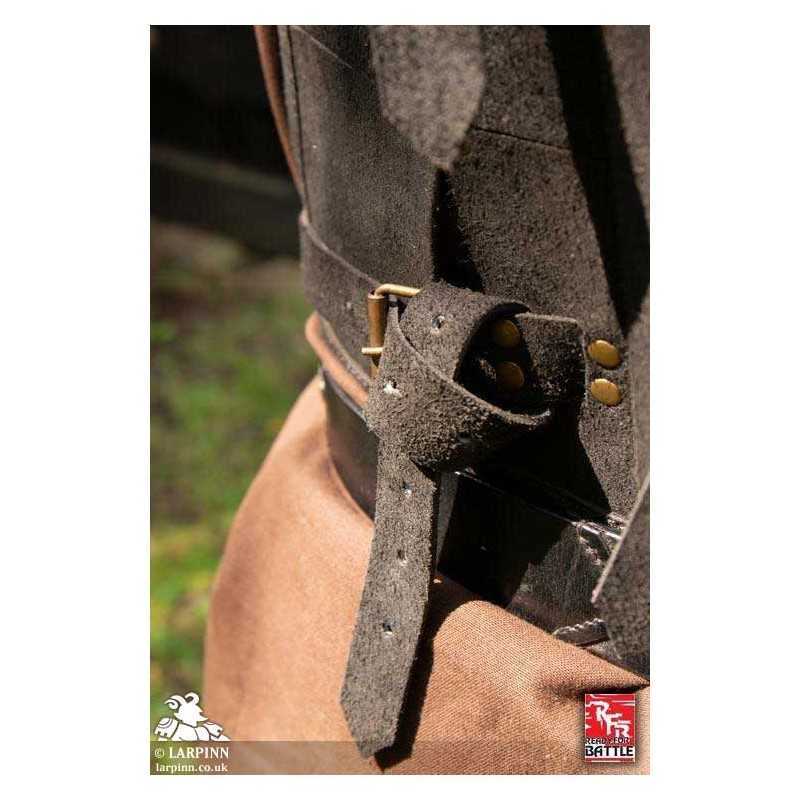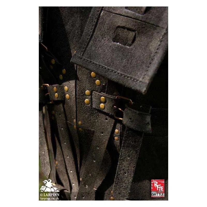 Epic Armoury’s Ready-for-Battle Leather Armour is a fancy leather cuirass with front and back plates to protect the torso from harm. The armour is constructed from black leather oblongs cut from chrome-tanned, plated leather, riveted with brass studs onto soft split-leather. With elongated sides to protect the flanks, the front and back plates are secured together by sturdy leather straps and iron buckles.