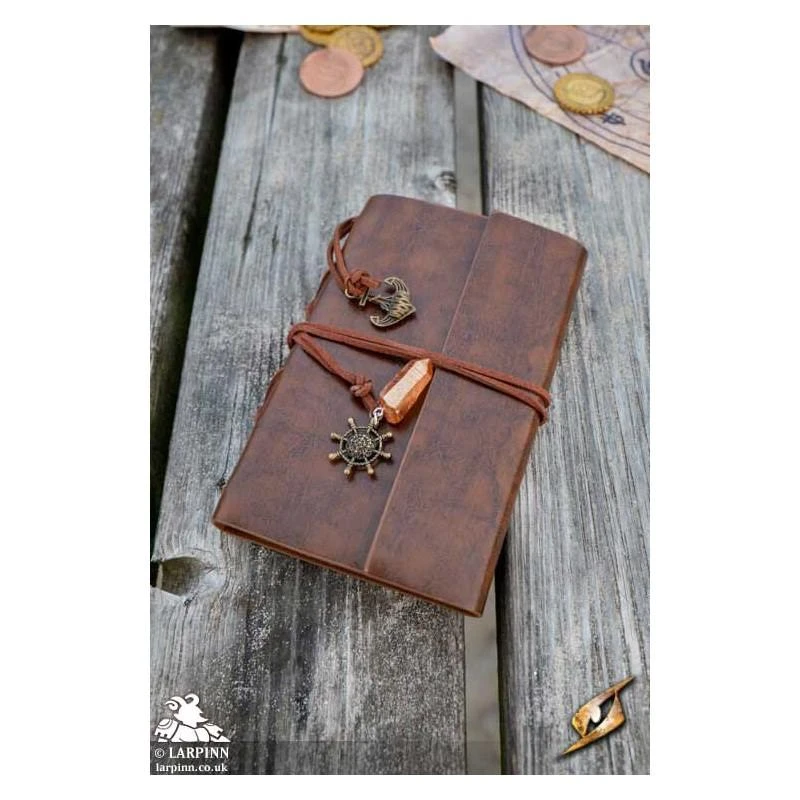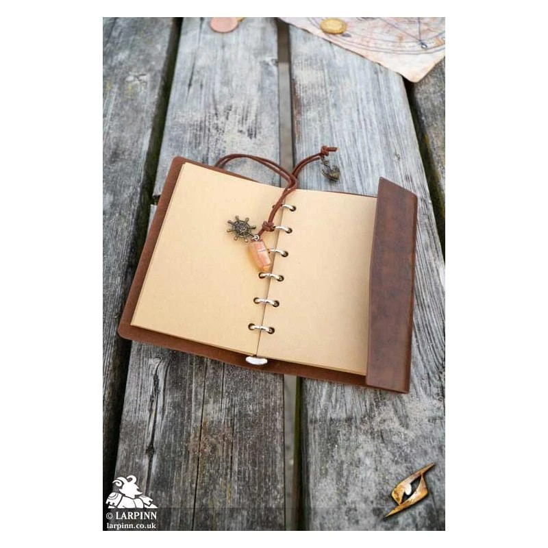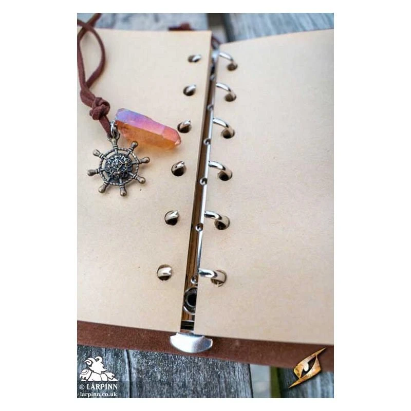With the Epic Armoury Sailor’s Diary, you can now record notes on your quests or describe your adventures for future generations! The book is designed as a bound ring binder with 55 sheets of tanned, 6-hole punched sheets measuring 8.5 × 13 cm. Thus, it is easy to add or remove additional pages if needed. The cover and string are made from faux leather with three pendants attached: Two shaped like a ship’s wheel and an anchor, and a third made from crystal.