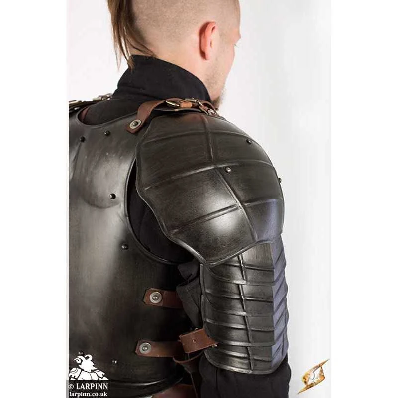 The Dark Drake Shoulder Plates are a set of two shoulder guards with spaulders, pauldrons and besagues. The spaulders have four scale-like ridged metal plates–or lames–overlaying one another to provide laminate protection of the upper arms. Overlaying the spaulder is a large pauldron, which provides additional protection to the shoulder joint and armpits. Besauges (small round convex metal shields) tied onto the spaulders with leather cords add further protection to the armpits. The shoulderplates are fastened with leather straps around the biceps and at the shoulder blade, attaching to a breast- and backplate. Epic Armoury breast- and backplates can be purchased separately and have fittings for mounting the shoulders.
