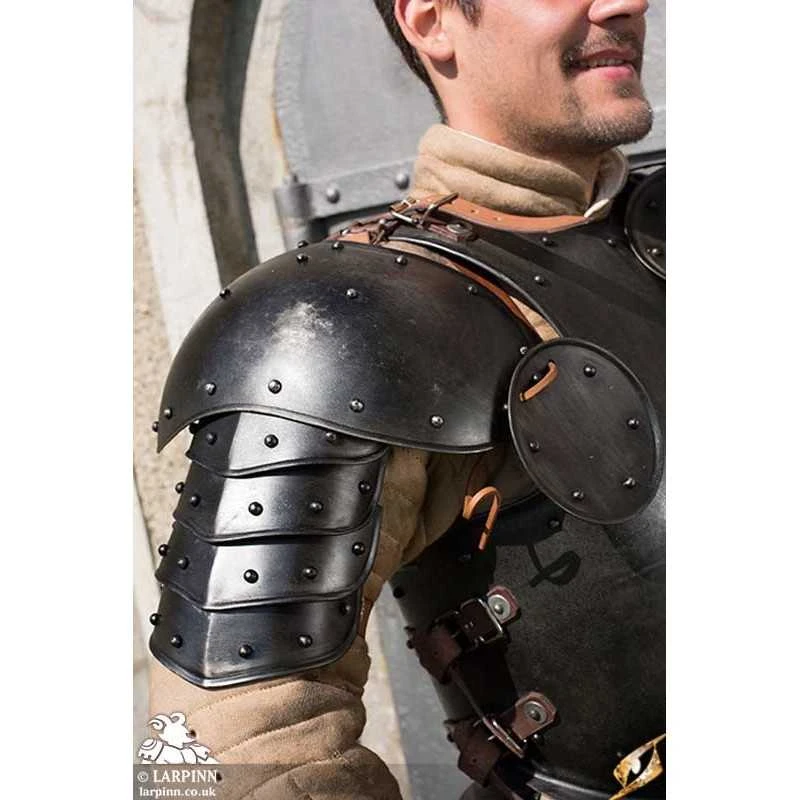 The Dark Warrior Shoulder Plates are a set of two shoulder guards with spaulders, pauldrons and besagues. The spaulders have five ridged metal plates–or lames–overlaying one another to provide laminate protection of the upper arms. Besauges (small round convex metal shields) tied onto the spaulders with leather cords add further protection to the armpits. Each plate is treated with Epic Armoury’s Epic Dark Metal coat, which gives the armour a rugged, antique finish. The shoulderplates are fastened with leather straps around the biceps and at the shoulder blade, attaching to a breast- and backplate. Epic Armoury breast- and backplates can be purchased separately and have fittings for mounting the shoulders.