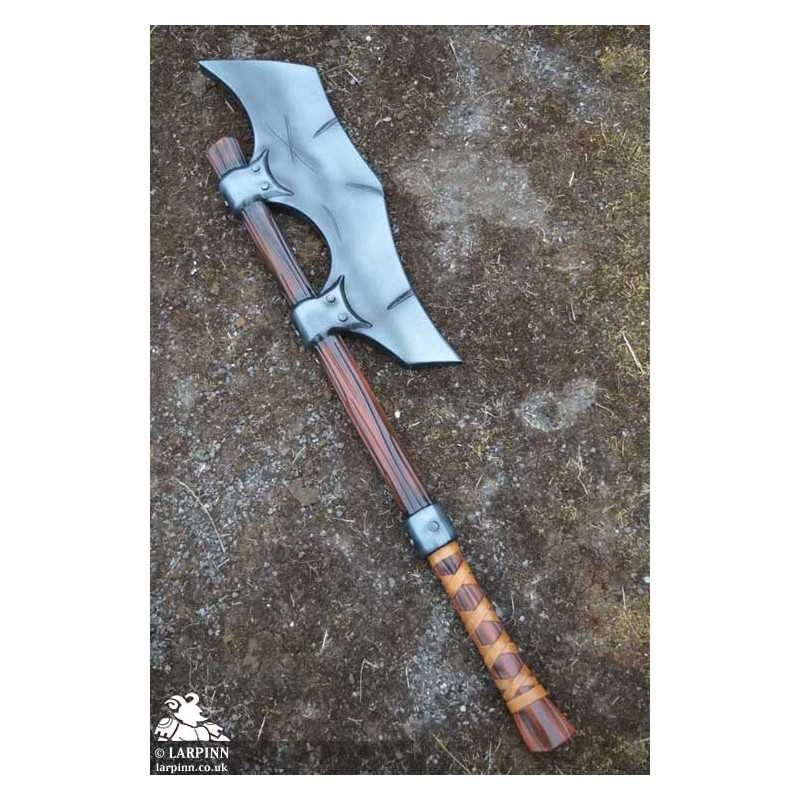 Epic Armoury’s Single Bladed Axe is a 105 cm latex is designed to be a practical weapon, versatile across your many costumes. The axe features a 51 cm long, curved head heavily detailed with notches and scratches to look like it’s seen abuse on the battlefield. Sculpted and hand painted, the head appears attached to the staff with solid riveted steel plates. The staff, with its detailed wooden texture, has a 26 cm long handle decorated to look wrapped in leather for extra grip.