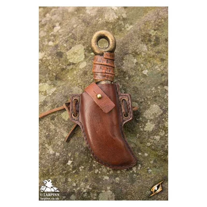 Epic Armoury’s Epic Black Skinner Knife Holder comes with a knife, and is specifically designed to hold the curved Epic Armoury Skinner Knife throwing weapon. The handmade holder attaches to the belt or armour using two leather ties. A leather strap buttons over the knife, keeping it secure even in rough fights.