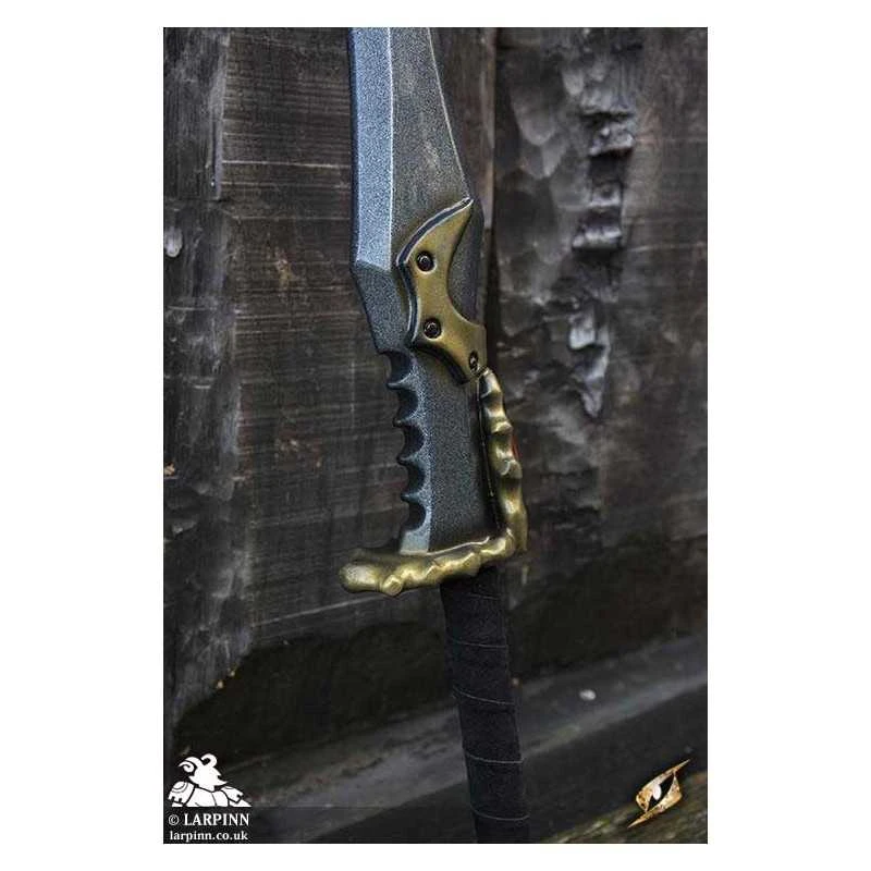 Epic Armoury’s Soulstealer is a latex sword designed for evil overlords or lucky tomb-raiders alike. The Soulstealer is 110 cm long with an 80 cm double-edged chopping-blade. The oval crossguard is gemmed and protects the 25 cm handle wrapped in split-leather. The length of the handle allows the sword to be wielded one- or two-handed, and ends with a coreless pommel handpainted to match the crossguard.