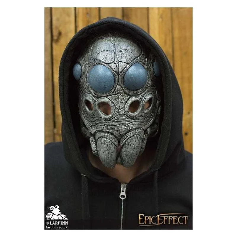 The face itself is wide with detailed, wrinkled features of a spider exoskeleton. Four bulbous blue eyes and pointed mandibles are sculpted and painted onto the mask’s face.