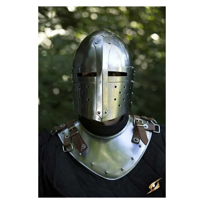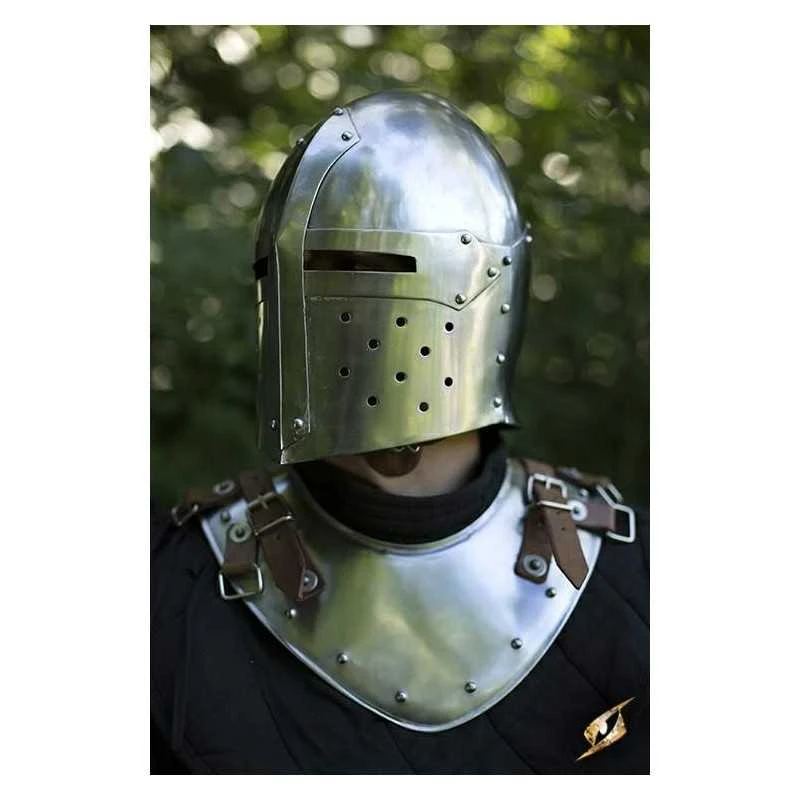 Epic Armoury’s Sugar Loaf Helmet is an enclosed helmet inspired by the traditional knight’s armour. Enclosing the entire head and offering maximum protection, this helmet is reinforced with rivets, rolled steel and a curved apex. Ventilation holes and a cotton inlay are added to the helmet to improve airflow and comfort. The eye-slits are wide and slim, increasing protection but impairing visibility.