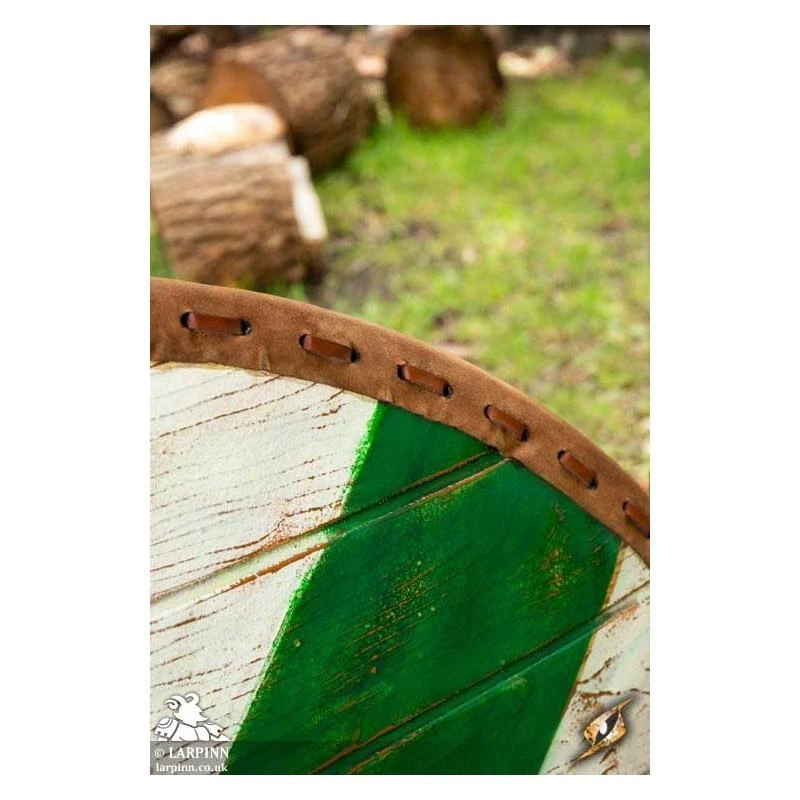 This shield has been hand painted to look like natural wood with a white field and green diagonal line decorating its face. The paint has been artistically done to appear worn and aged, perfect for your gritty fantasy game or on the television screen. Its slight convex shape and the metallic-painted boss on the front provides an edge in combat, and its reliable punch-grip fits comfortably in your hand thanks to its suede wrap and shape. Keep your shield in great condition with regular latex maintenance.