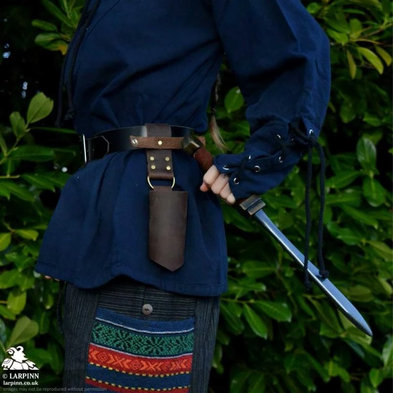 The Ulborin Dagger Scabbard is secure way to keep your small weapons safe whilst you run around adventuring. The popper keeps your weapon in place despite the wide fit being perfect for a lot of larger blades. The D ring design offers flexibility and prevents the dagger getting stuck on things as you move around. This scabbard is a great addition to any LARP, cosplay or theatre costume.