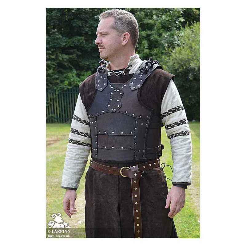 The Ulric Leather Armour is a flexible leather vest that can be worn on its own, or as part of the Ulric Armour Set. This armour is constructed from thick dyed leather which are both sewn and riveted in places. Each segment is layered and the edges are covered with soft leather edging. The flexibility of the Ulric Armour is great in combat making this a fantastic LARP item. However, the style is great for a number of medieval and fantasy, cosplay and theatre costumes.