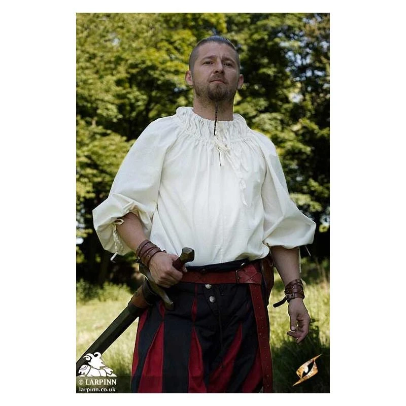 Epic Armoury’s Undershirt is a loose, lightweight, and versatile shirt with a raglan neckline that reaches from the shoulders to the hips. Made from light cotton, this shirt’s neckline is adjustable using a double set of drawstrings, allowing you the freedom to wear the shirt tightly around the neck or draped across the shoulders. Drawstrings at the wrists also allow you to wear the sleeves hanging loose or tied tight at the wrists.