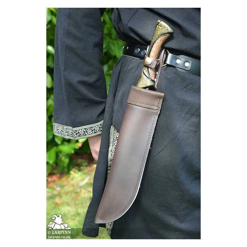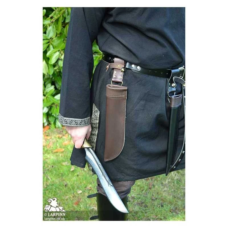 The Varius Dagger Scabbard is a handmade leather dagger holder which ensures that your weapon is kept safe and secure. Designed for use with Larp, Cosplay or theater costumes, the soft trim helps to protect latex props and the popper design can be used to provide extra security for smaller blades. This particular holster hangs straight down and uses a D ring to increase flexibility when you move.