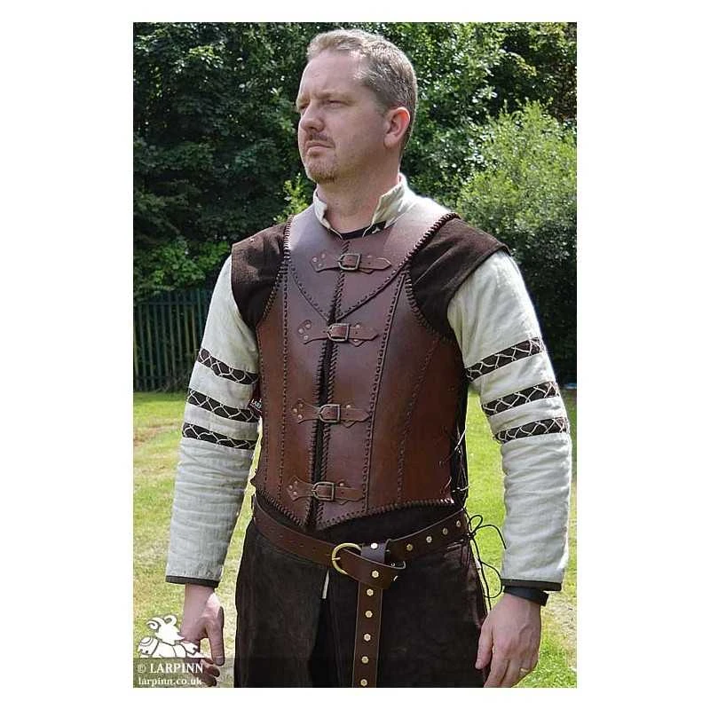 This bestselling Epic Armoury Veteran Armour is a typical western cuirass designed to protect the whole torso. The cuirass secures tight over the breast and abdomen using four sturdy leather straps–each riveted with decorative brass studs–and brass buckles. It is highly adjustable both at the front, but also with strong leather cords at the flanks.