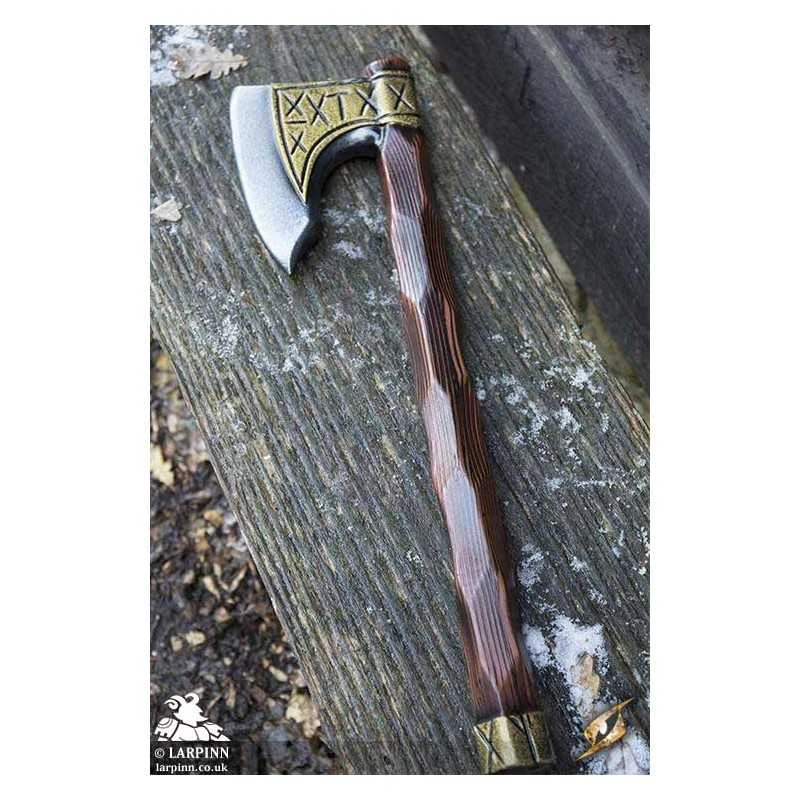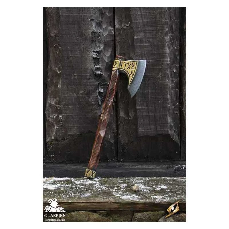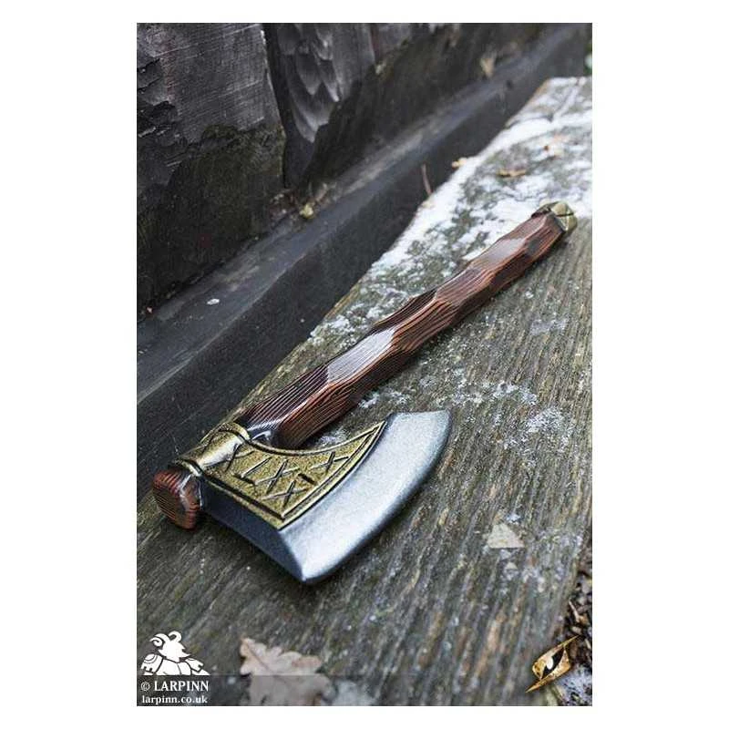 Epic Armoury’s new improved version of the bestselling Viking Short Axe is reinforced to make it even more durable. The axe-head has a 18 cm edge and a golden embellishment that matches the pommel. The handle is 45 cm long and carved to look like rough wood grain without a specific grip, encouraging the user to make use of the axe’s versatile design.