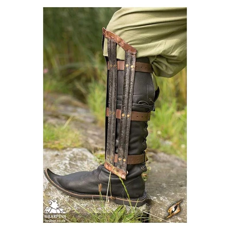 The Viking Leg Protection is a set of greaves inspired by ancient splint armour. At first glance, the Viking Leg Protection may appear fragile, but don’t let that fool you! These greaves can be worn over leather or clothing, and the vertical steel strips offer excellent protection of your shins without encumbering you or hindering your mobility.