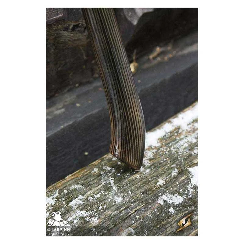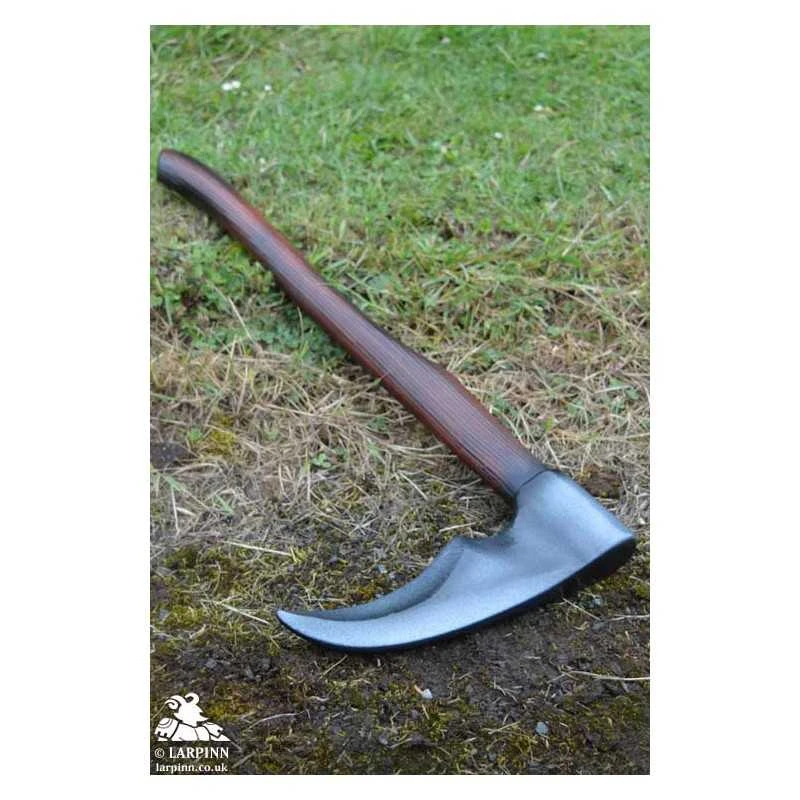 Epic Armoury’s War Scythe is a 60 cm latex short axe with a 20 cm blade. The weapon is entirely handpainted with wood-grain and metal finishes. The blade is angled and designed to match the realism of the traditionally shaped handle, with a deadly hook at the end inspired by the weapons that could rip through armour…as well as more obvious farmer’s tool!